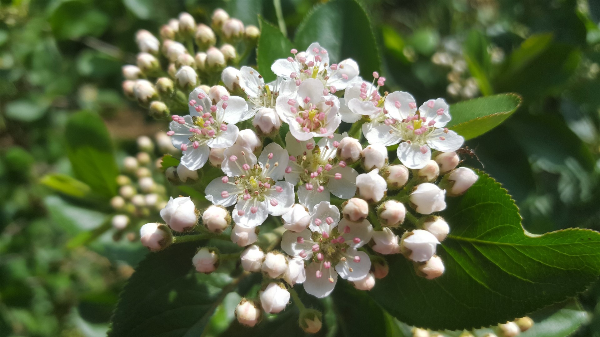 Der Aroniastrauch trägt im Mai eine weiße Blütendolden mit bis zu 20 Blüten.